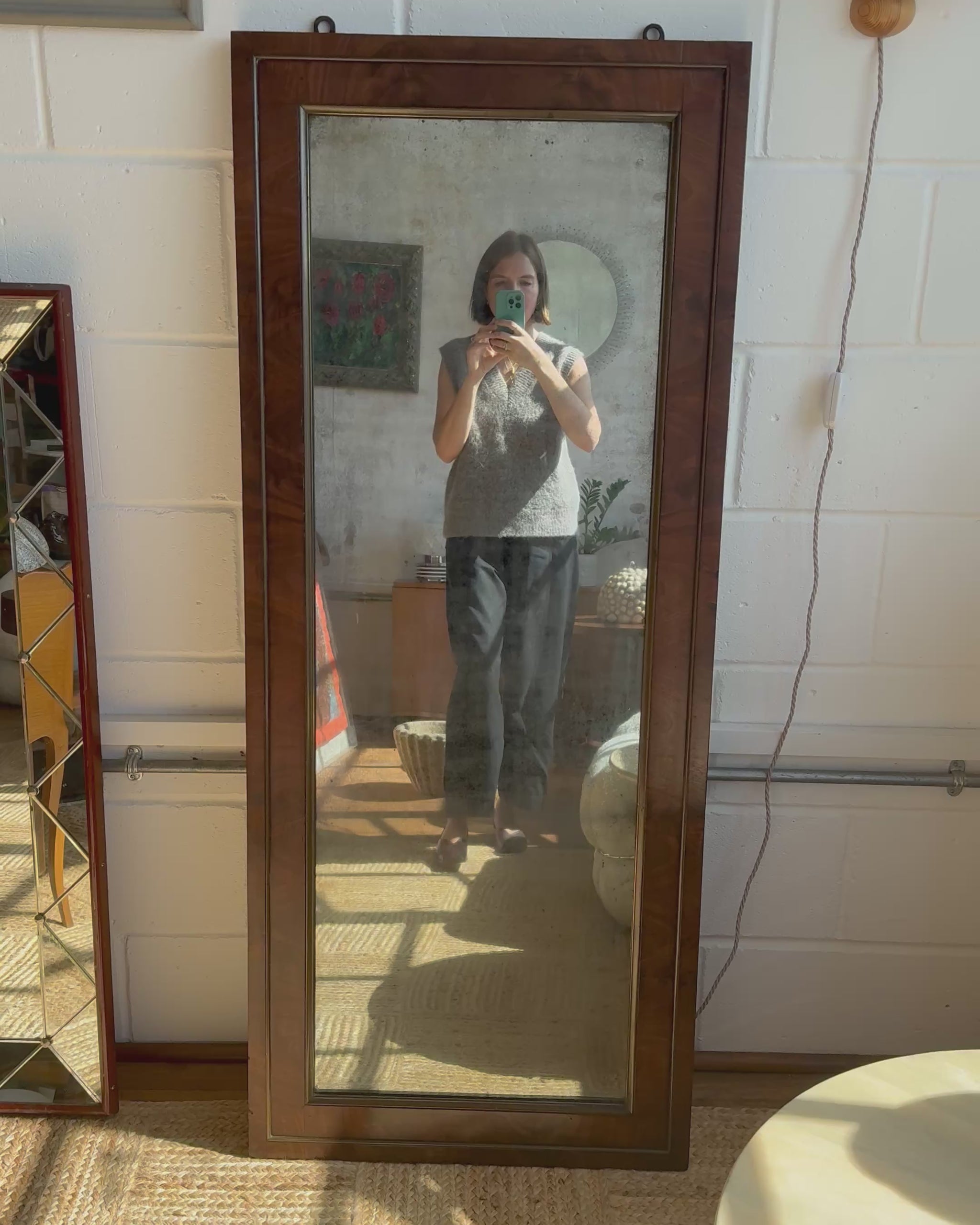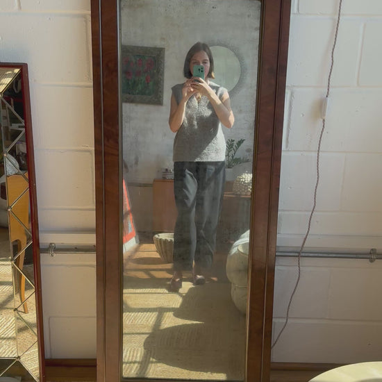 An absolutely stunning mahogany 19th Century Empire mirror with brass inlay. Amazing warmth and patterns in the wood with gorgeous foxing and patina, it would make a beautiful statement in a hallway or bedroom. It can be wall hung with the two hooks at the top. Exceptional quality and amazing condition with expected patina for its age.