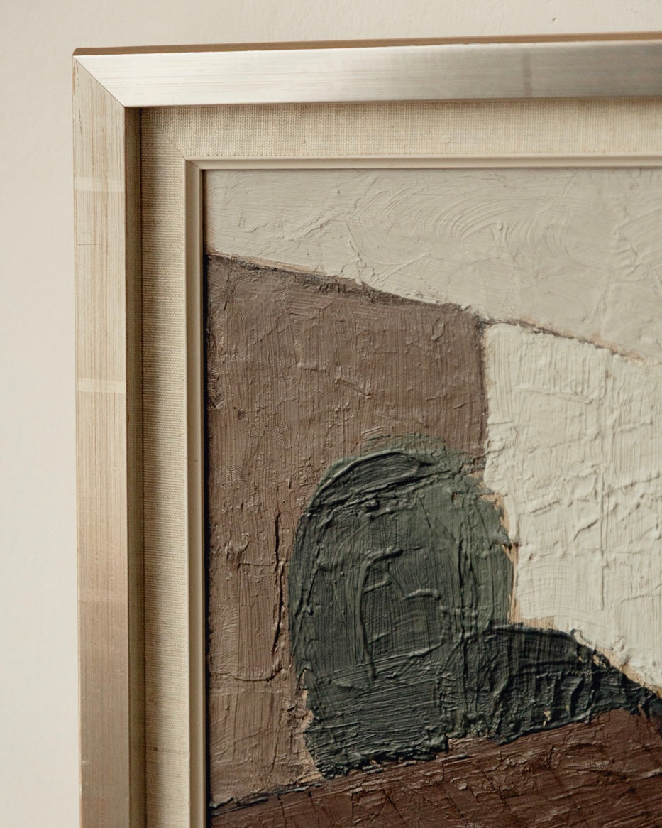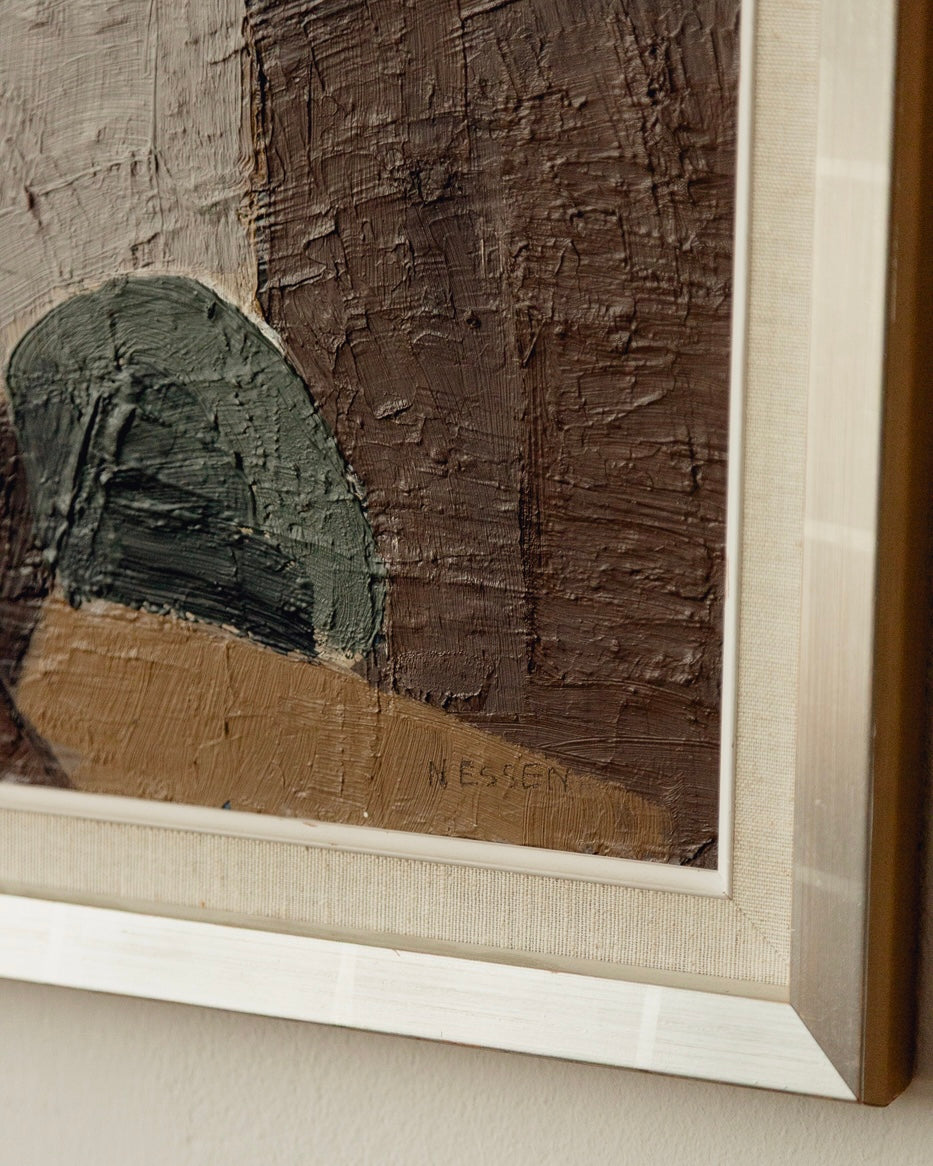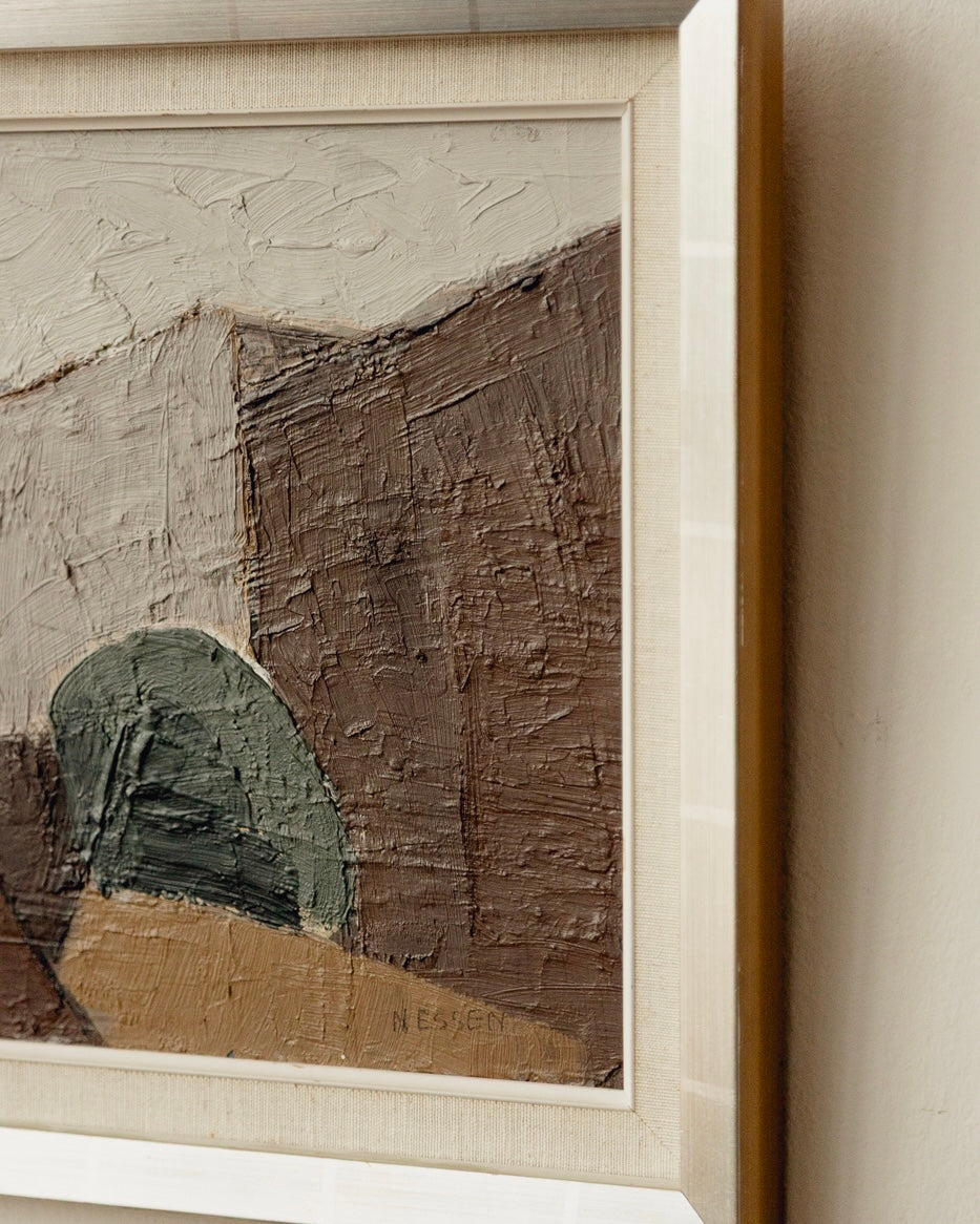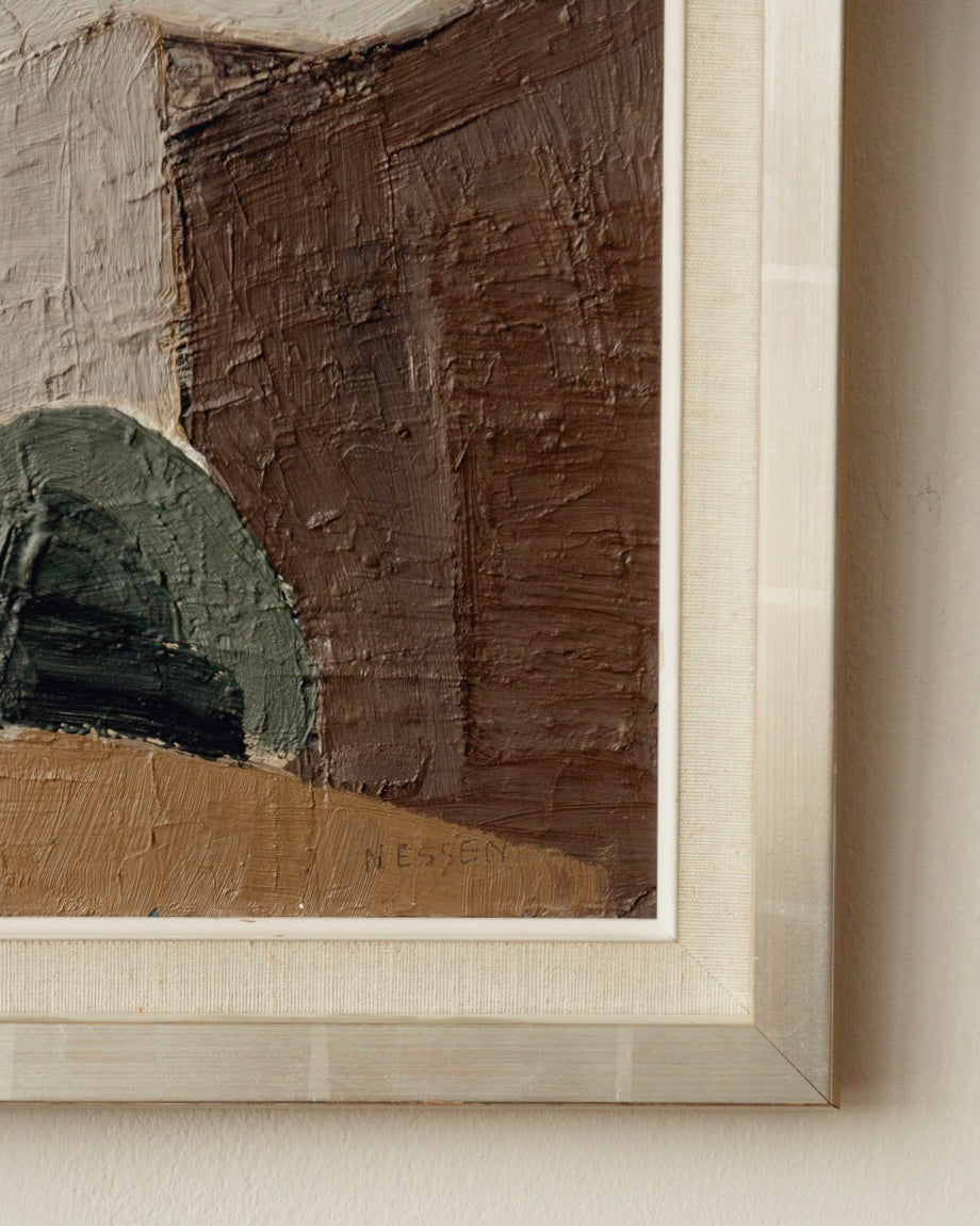 A wonderful mid century signed Swedish oil by Cubist artist Nils Essen (1925-2005). Beautifully textured palette of nudes and browns in a simple linen mounted metallic wooden frame. Great vintage condition with minimal wear. Information on the artist attached to the reverse.