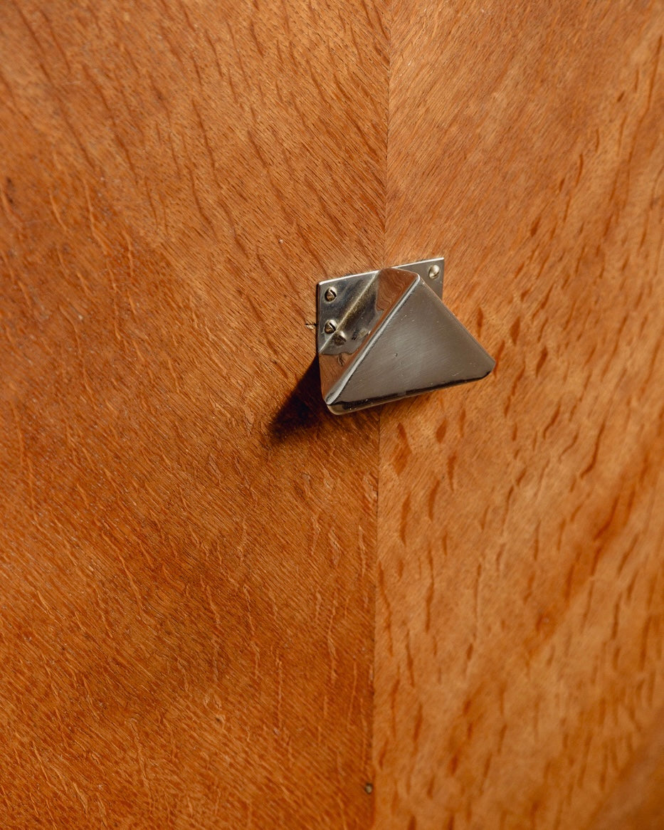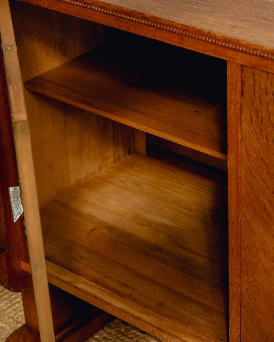 Stunning Art Deco oak sideboard with original handles. A great size for smaller spaces and alcoves with shelves and drawers inside the cupboards providing ample storage. Wonderful vintage condition with minimal wear as shown in the images. One tiny chip to back foot (see image). Beautiful details and grain to the wood with original solid chrome handles. Exceptional quality and craftsmanship.
