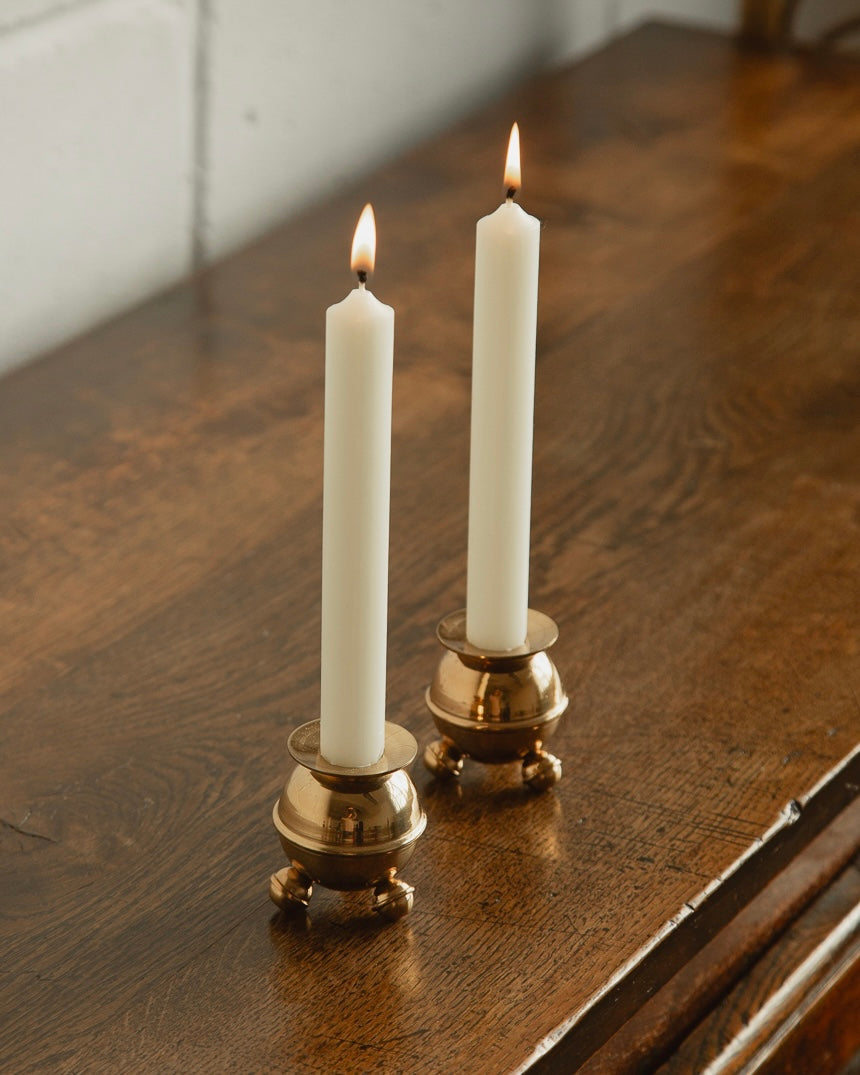 A gorgeous pair of Swedish sphere brass candle holders on balled feet. Solid, heavy and extremely well made. Great vintage condition with minimal age related patina. Hold standard dinner candles.