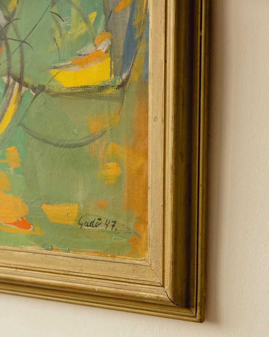 Incredible large signed Swedish oil by Bertil Gadö (1916-2014) dated 1947. Beautiful colours and movement through the brushstrokes, it would be an incredible injection of colour in any interiors scheme. Great vintage condition and a metallic wooden frame.