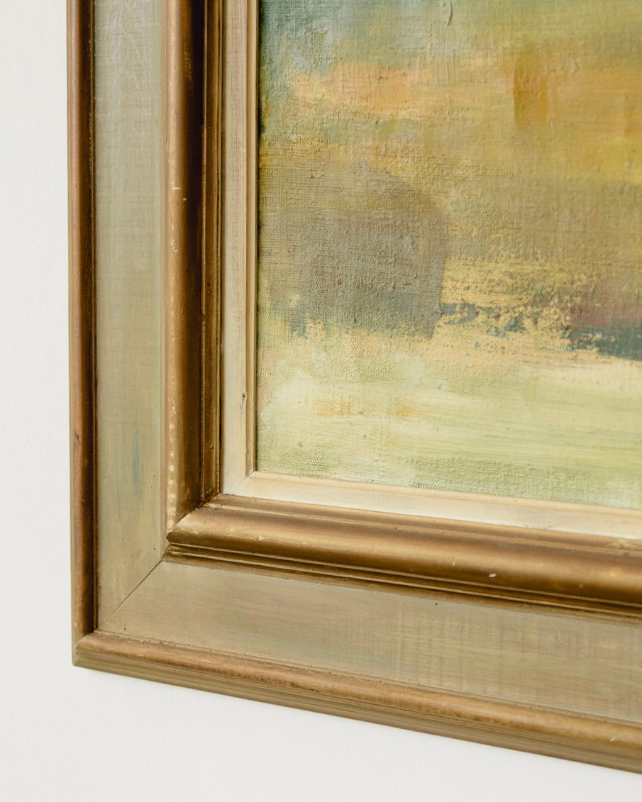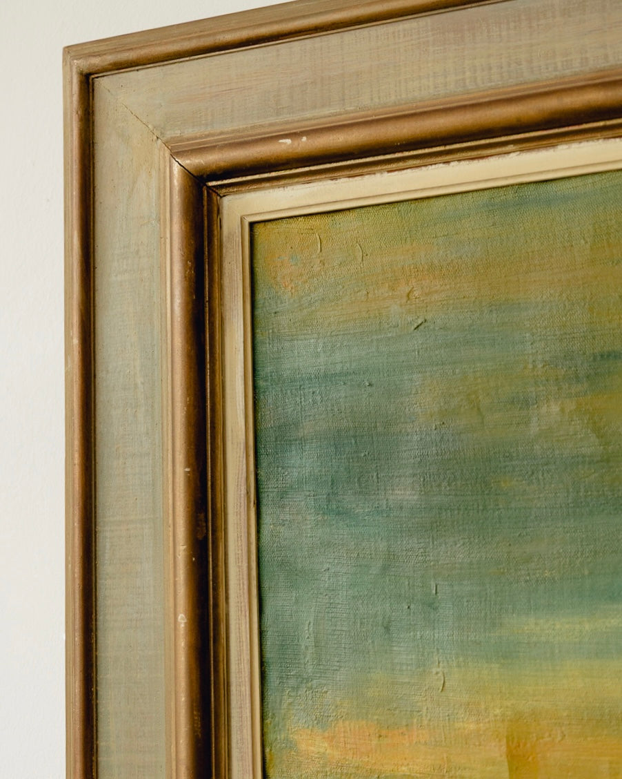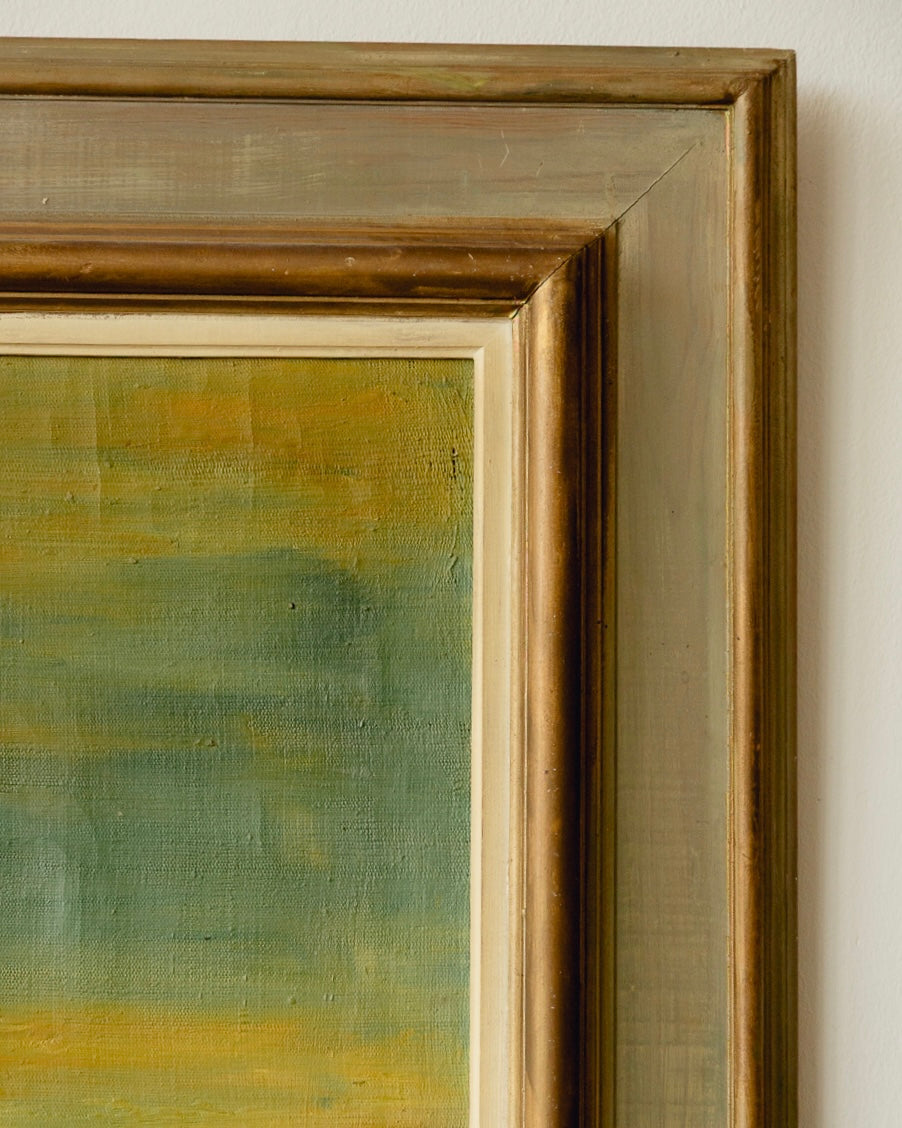 Large landscape oil by Veikko Aaltona (1910–1990) in its original wooden frame. Wonderful colour palette of greens, yellows and burnt oranges with beautiful textured brushstrokes. Great vintage condition with just a few scuffs to the frame.