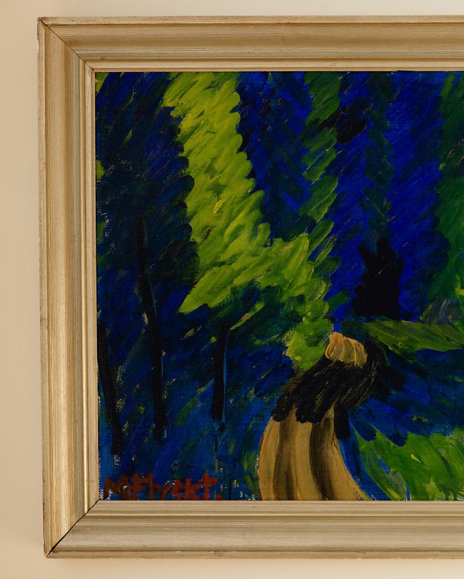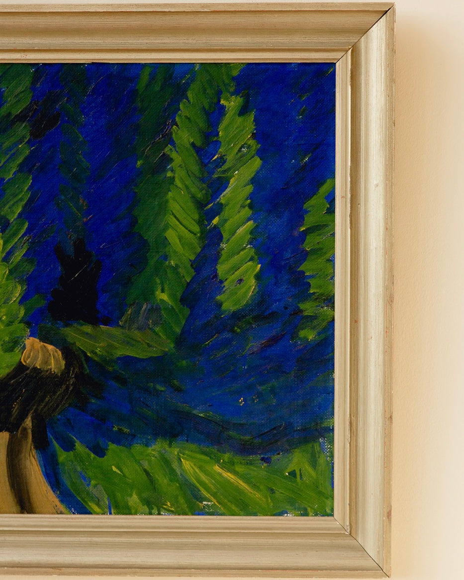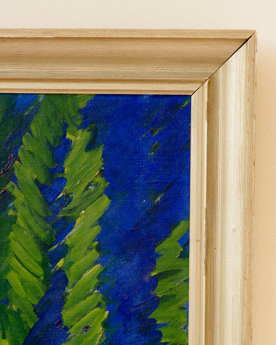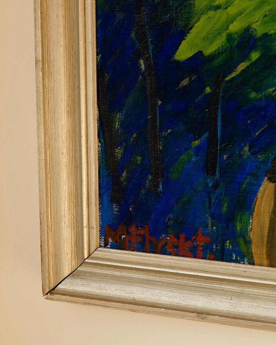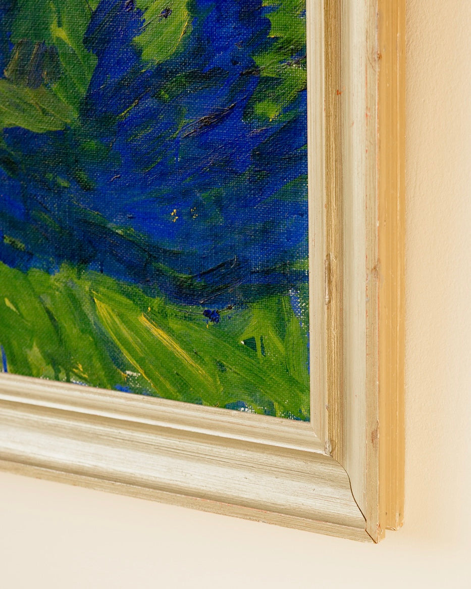 Incredible large signed Swedish oil by Manfred Flyckt (1893 - 1956). Beautiful textures and movement through the brushstrokes, the cobalt blue would be an incredible injection of colour in any interiors scheme. Great vintage condition and a beautiful metallic wooden frame.