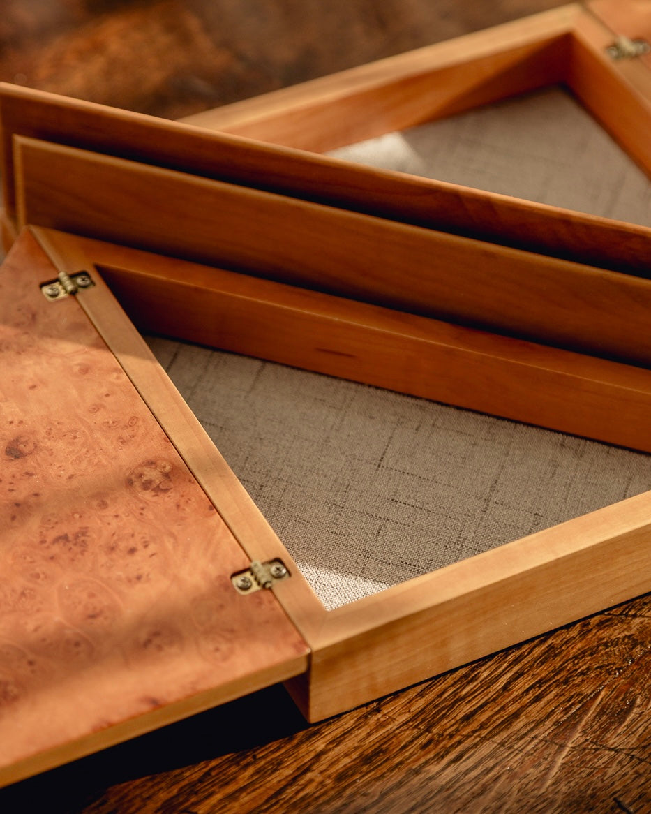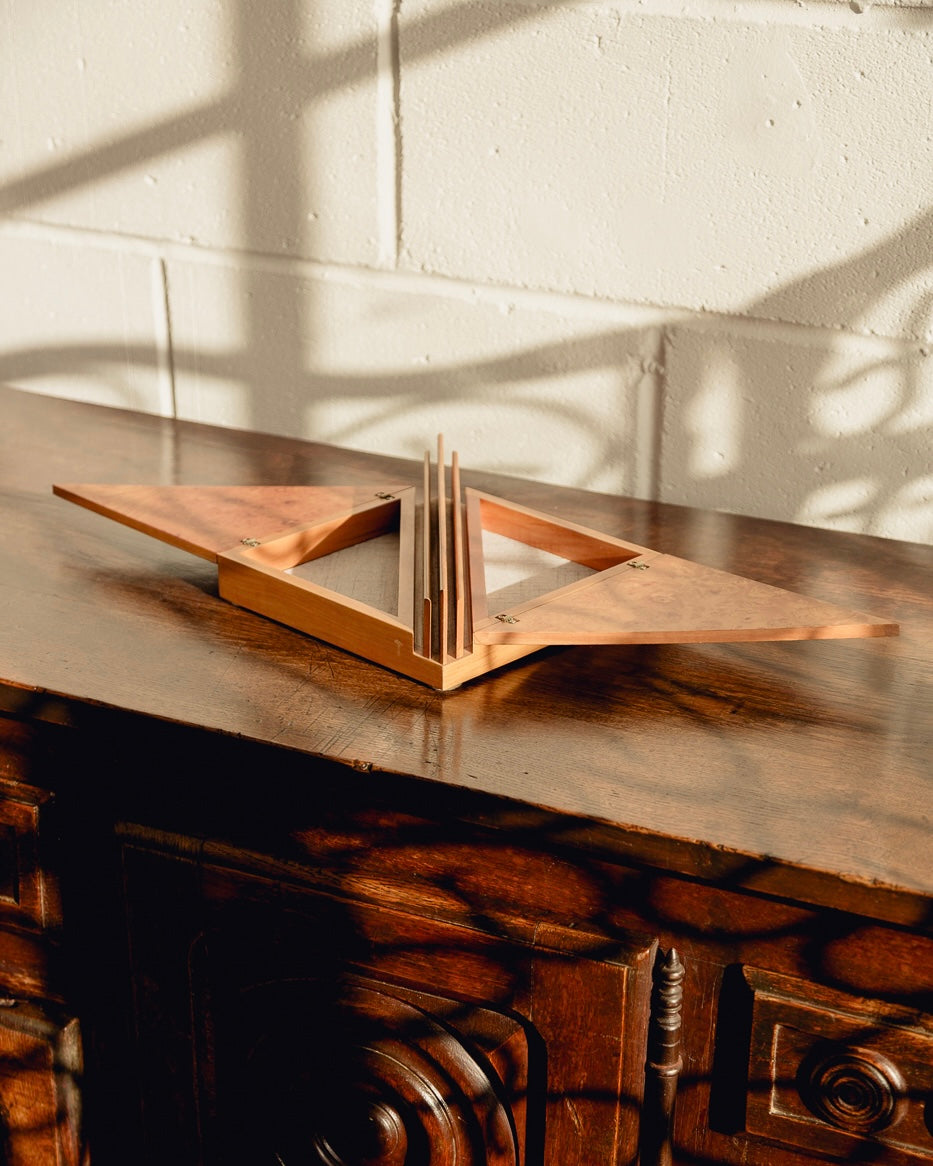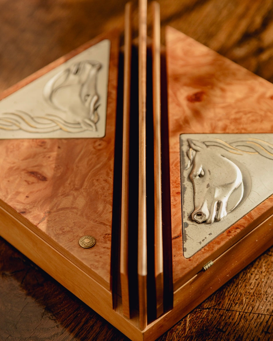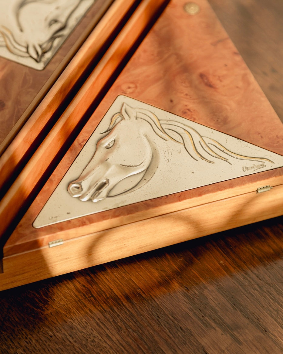 Beautiful signed vintage Italian box made from burl wood with inlaid silver horse motifs. The geometric form and sculptural detailing highlight the natural beauty of the wood in contrast to the silver plates. It would make an amazing desk tidy or catch all for a coffee table/hallway with a centred letter holding feature. Wonderful vintage condition with minimal wear.