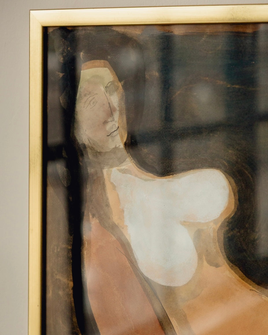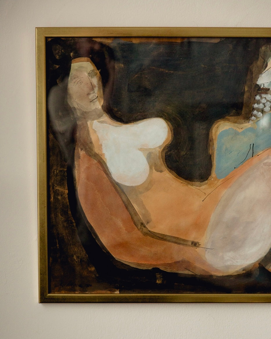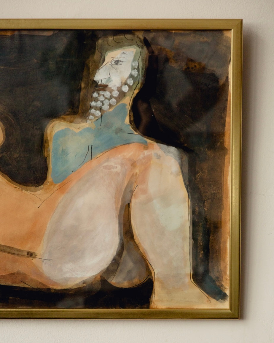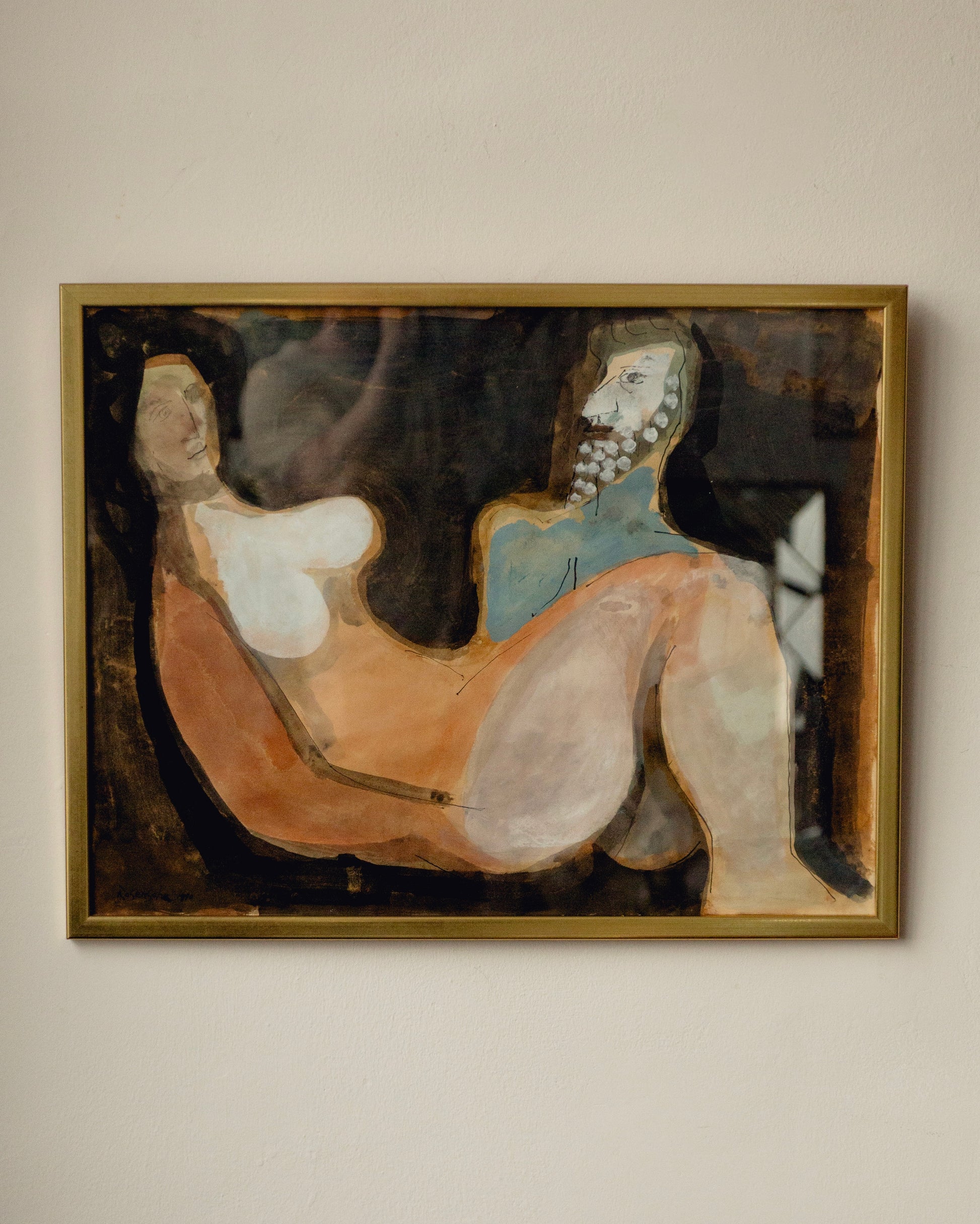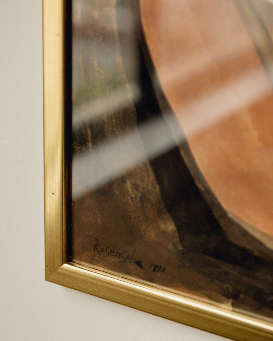A wonderful signed watercolour and ink painting by Swedish artist Mauritz Lennart Rosensohn (1918-1994). Beautiful colours and details in a simple metallic glazed frame. Great vintage condition with minimal wear.