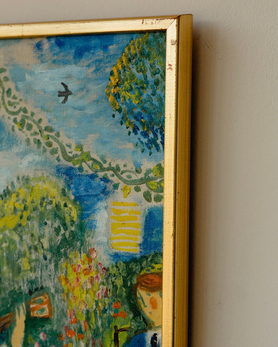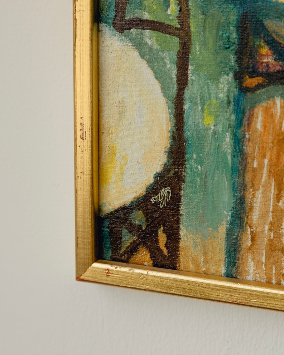 Wonderful mid-century oil painting, featuring a vibrant outdoor scene filled with joy. The musician plays amongst greenery and flowers, while festive garlands and lanterns adorn the sky, creating an enchanting atmosphere. Perfect for adding a touch of joy and colour to your space, signed bottom left corner. Great vintage condition with minimal wear to its original frame.