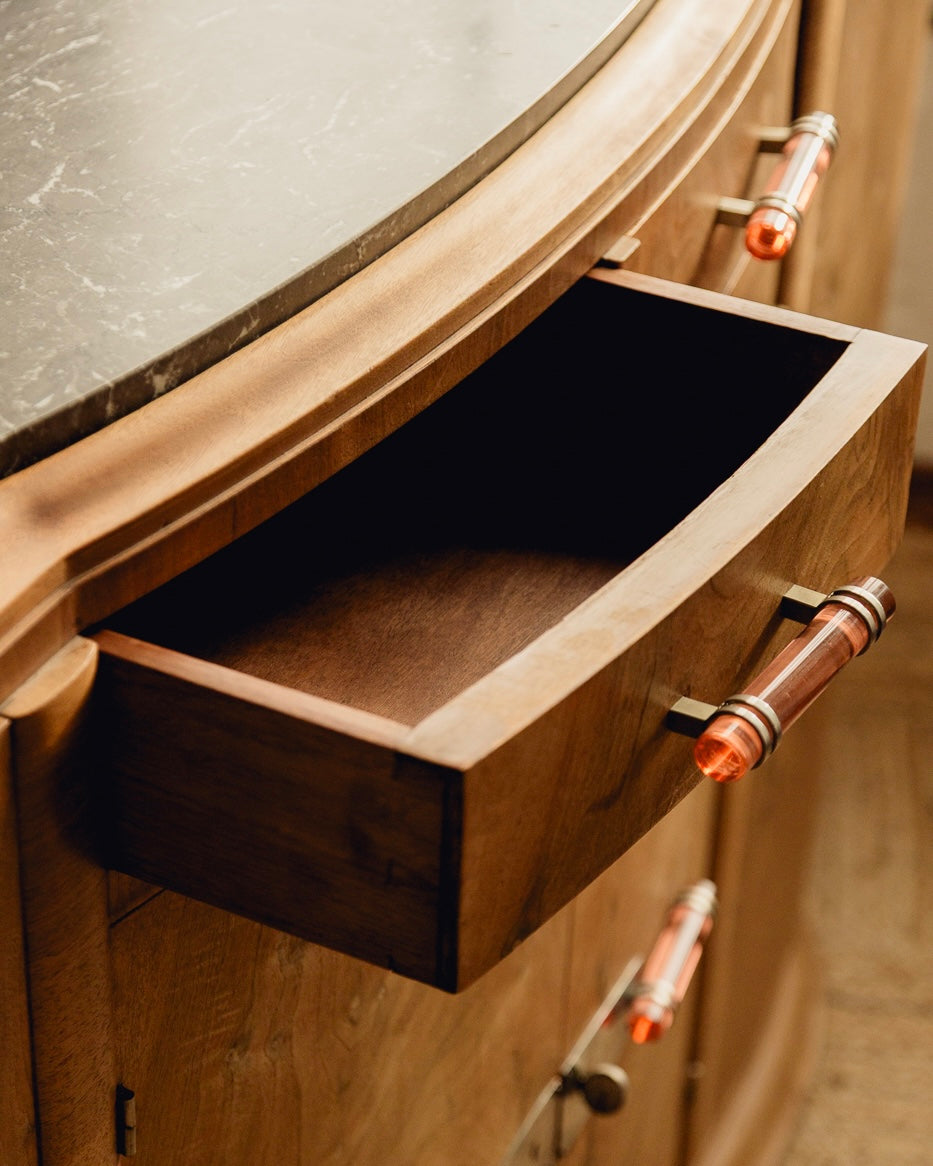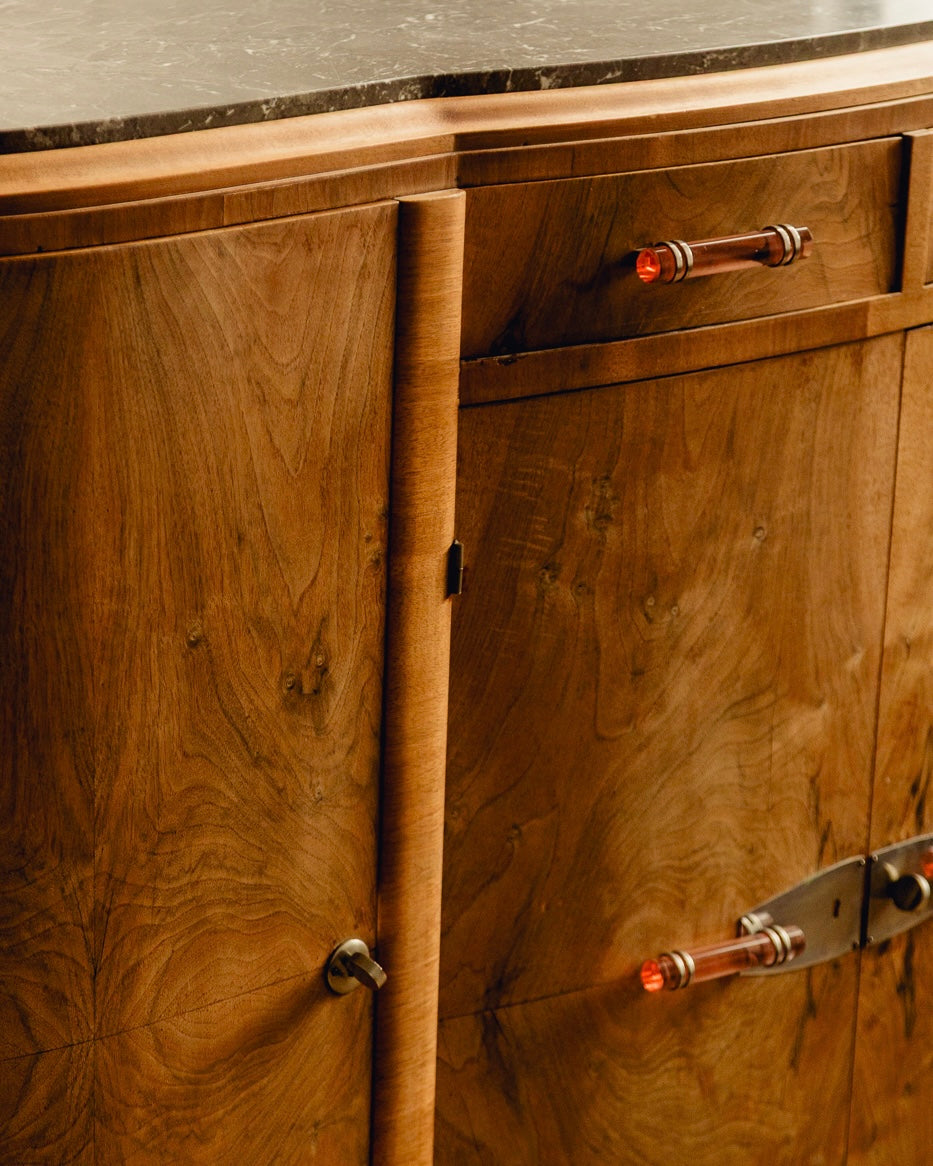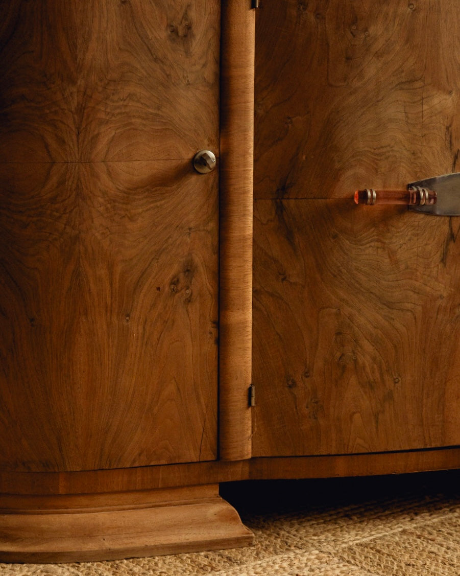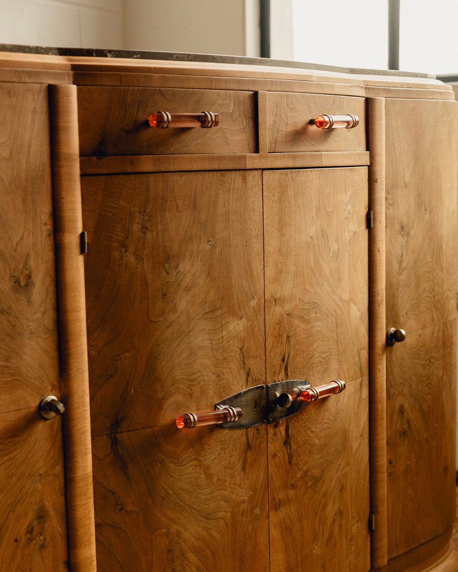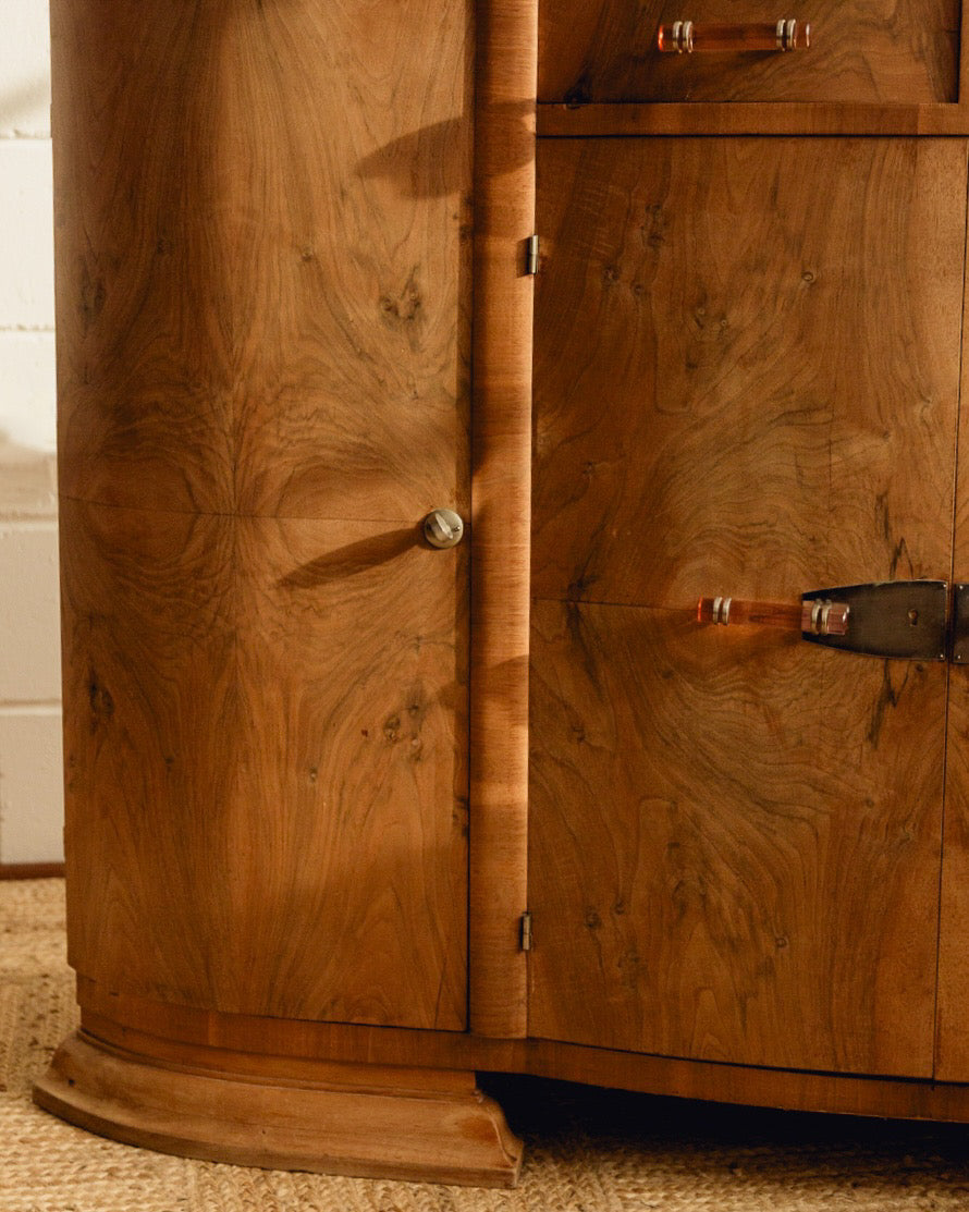 Incredible 1920’s burl veneer sideboard with a marble top. Ample storage with deep drawers and internal shelves. Perfect for a kitchen or dining room. The quality is incredible with beautiful details on the shelves and original deco keys and handles. Great vintage condition with minimal age related wear shown in images. The wood has a stunning grain which is complemented so will with all the curves of the design and the patterns of the marble.