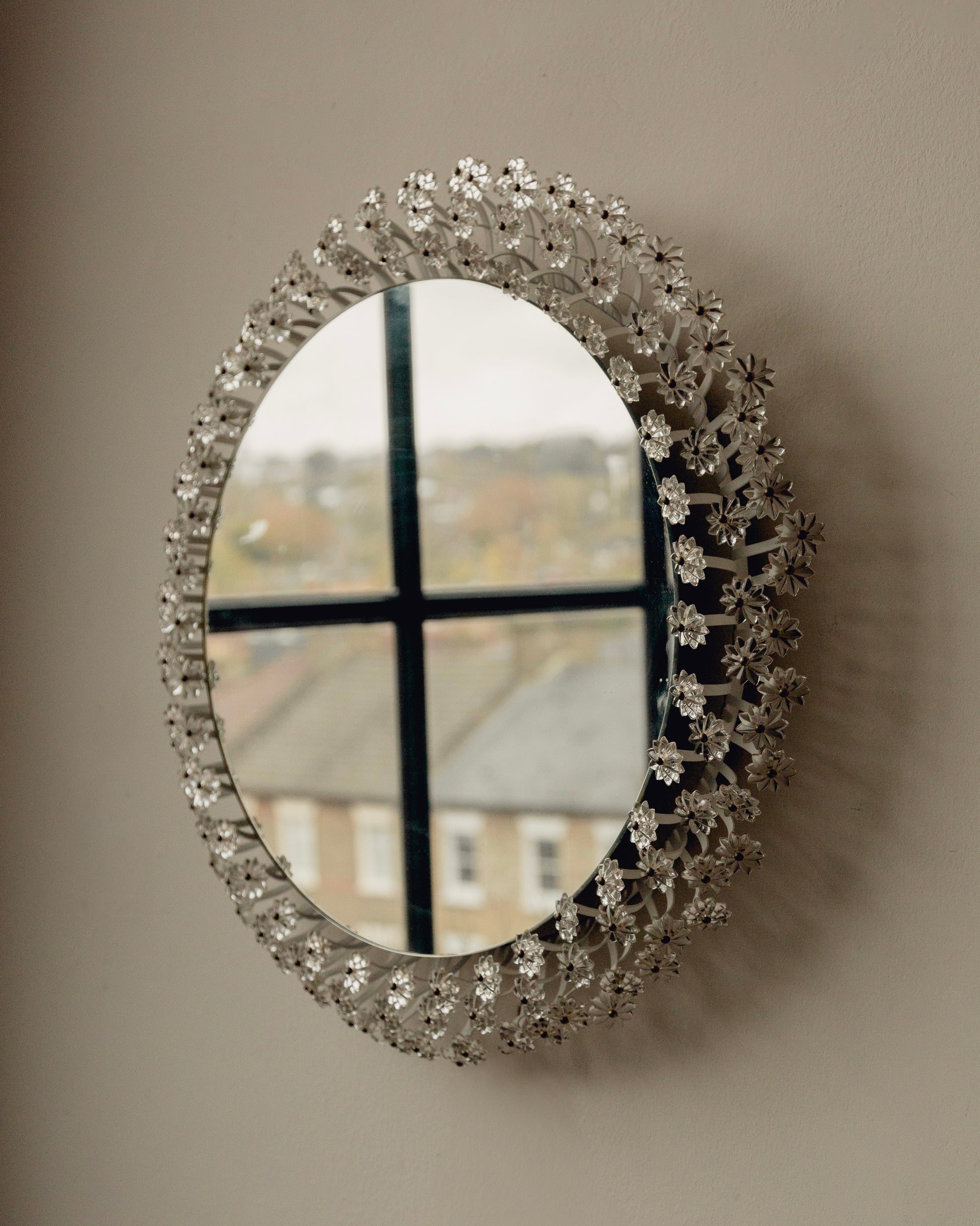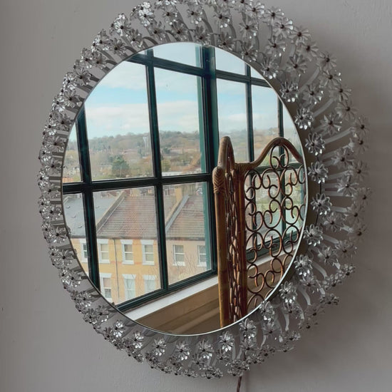 A wonderful mid century backlit mirror by Emil Stejner. An incredible and iconic design piece featuring hundreds of handmade glass flowers. Illuminated with a neon ring the mirror is held on the frame by 3 strong magnets. Rewired with an exposed twist flex so it can be plugged straight in or alternatively it can be hard wired in to the wall. Fantastic vintage condition with minimal wear.