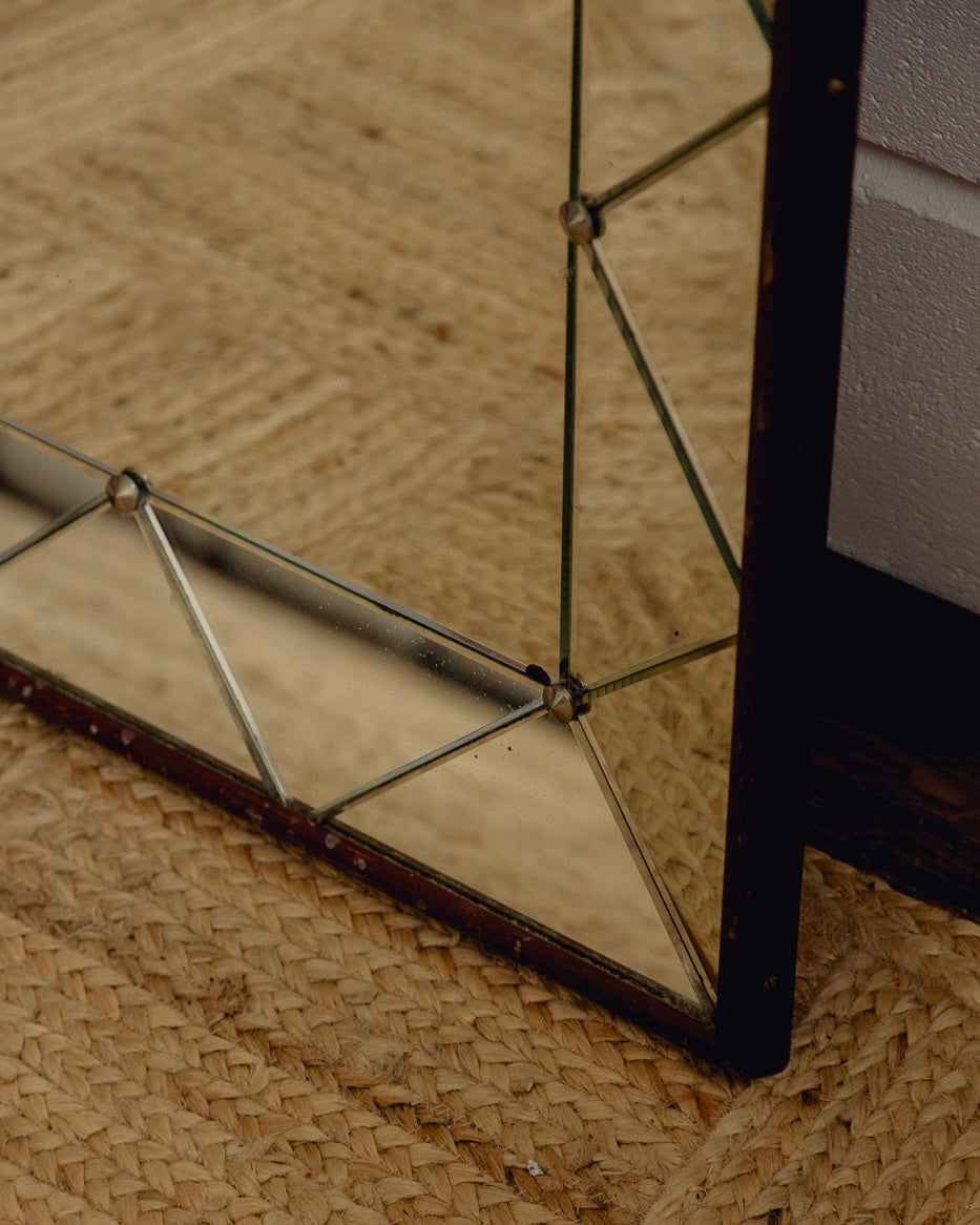 Beautiful Mid Century Swedish mirror. Teak frame, with a central rectangular mirror surrounded by a border of triangular cut mirror pieces, held in place by chromed screw in studs. Incredibly well made and in fantastic vintage condition. Minimal wear to the glass with just a couple of areas of foxing/patina which add to its beauty and charm. No chips or cracks. It would look beautiful in a bedroom or hallway. Holes at the back for hanging. Sourced in Sweden.