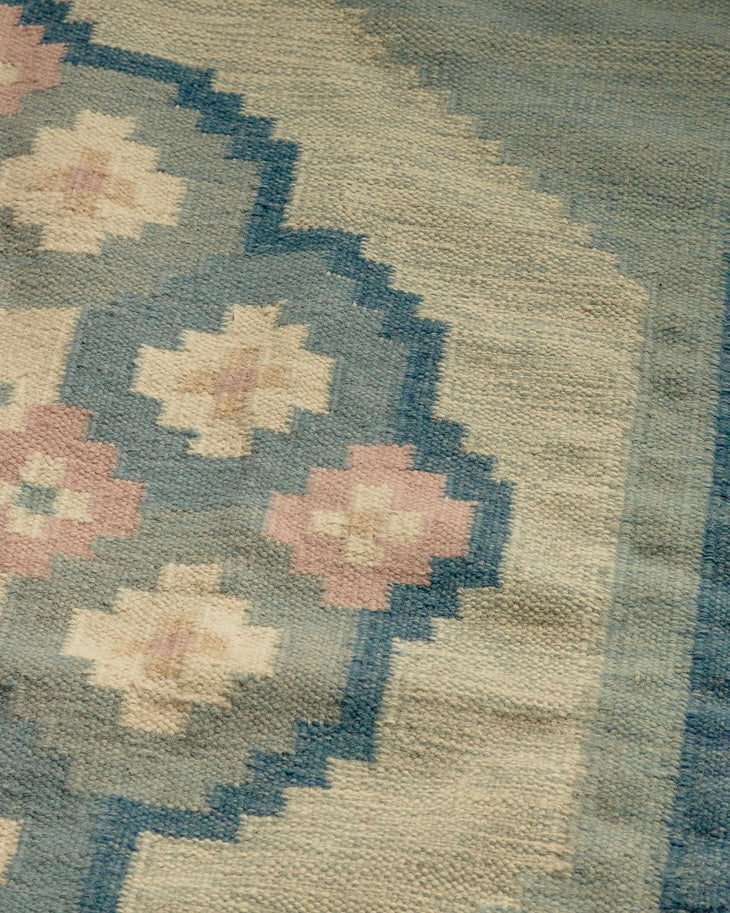 A beautiful hand woven wool rug from Dalarna Sweden. A pastel palette with details in blues and pinks. Great vintage condition with minimal marks/age related wear.